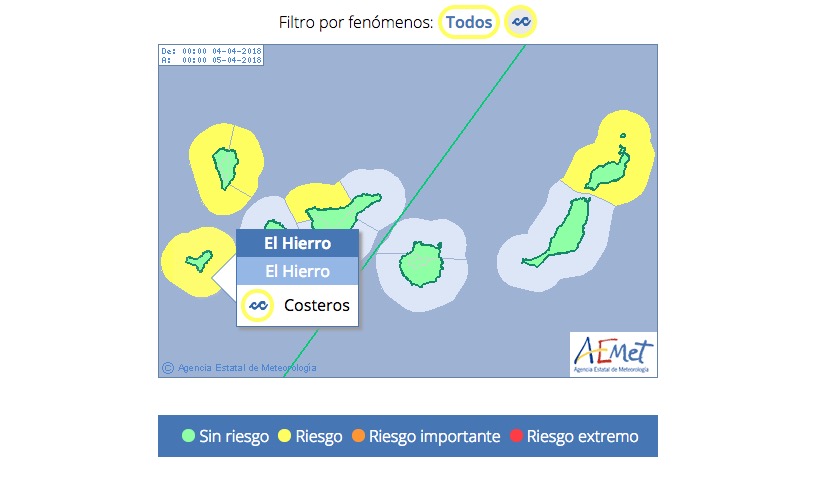 GMº/La Agencia Estatal de Meteorología (AEMET) activa el Aviso Amarillo por fenómenos costeros en las aguas de El Hierro entre las 15:00 y las 22:00