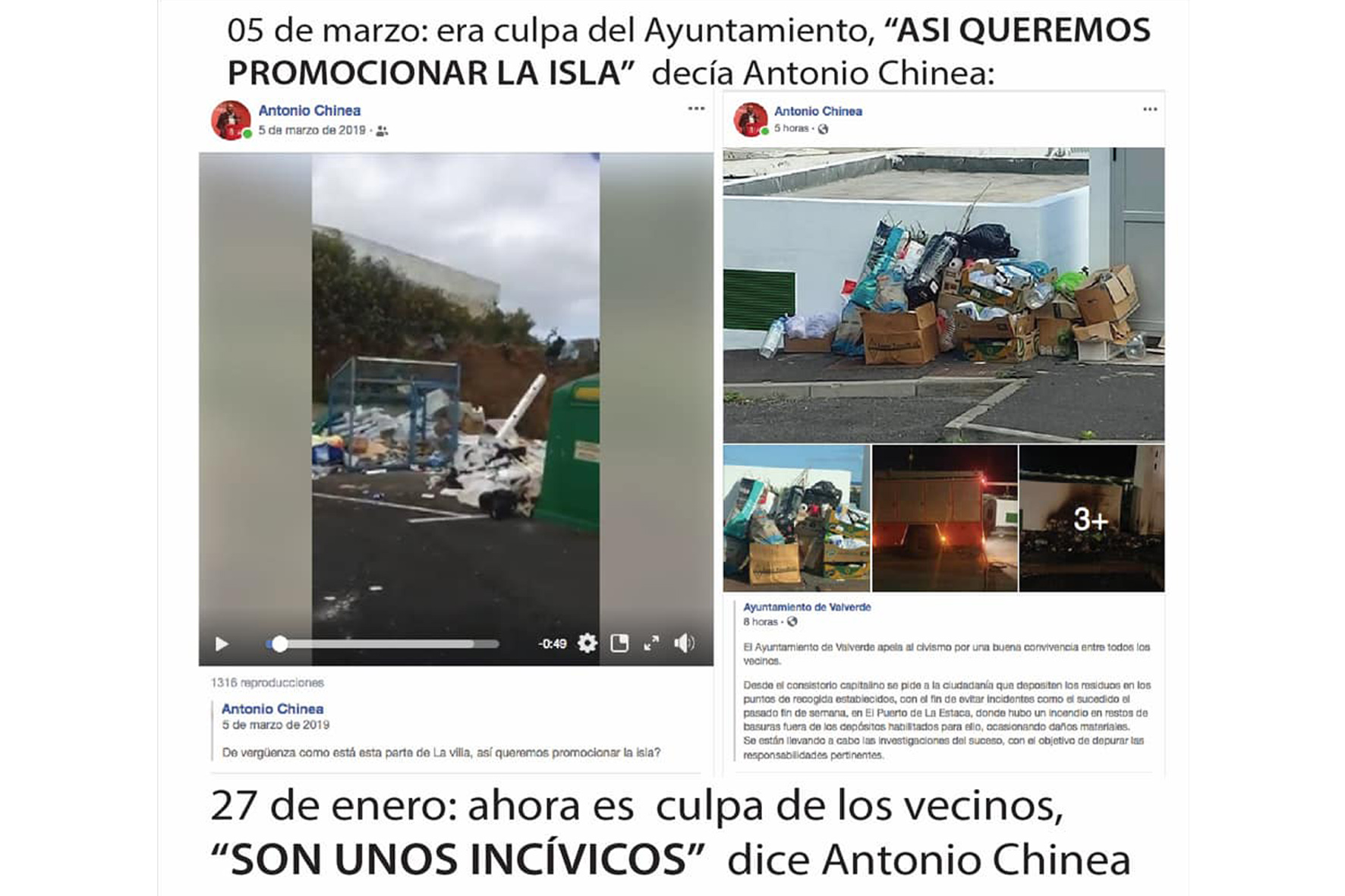 Redacción/Antonio Chinea, alcalde de la Villa de Valverde a reaccionado así, ante las criticas vertidas por la oposición de la Agrupación Herreña Independiente (AHI), cuando el pasado 28 de enero, difundan a través de Facebook una imagen que mostraba contenedores de basura atestados en la zona de San Juan en la Villa de Valverde, que evidenciaban la mala gestión de recogida de residuos en la capital herreña, acompañadas con declaraciones que la AHI atribuía al propio Chinea.