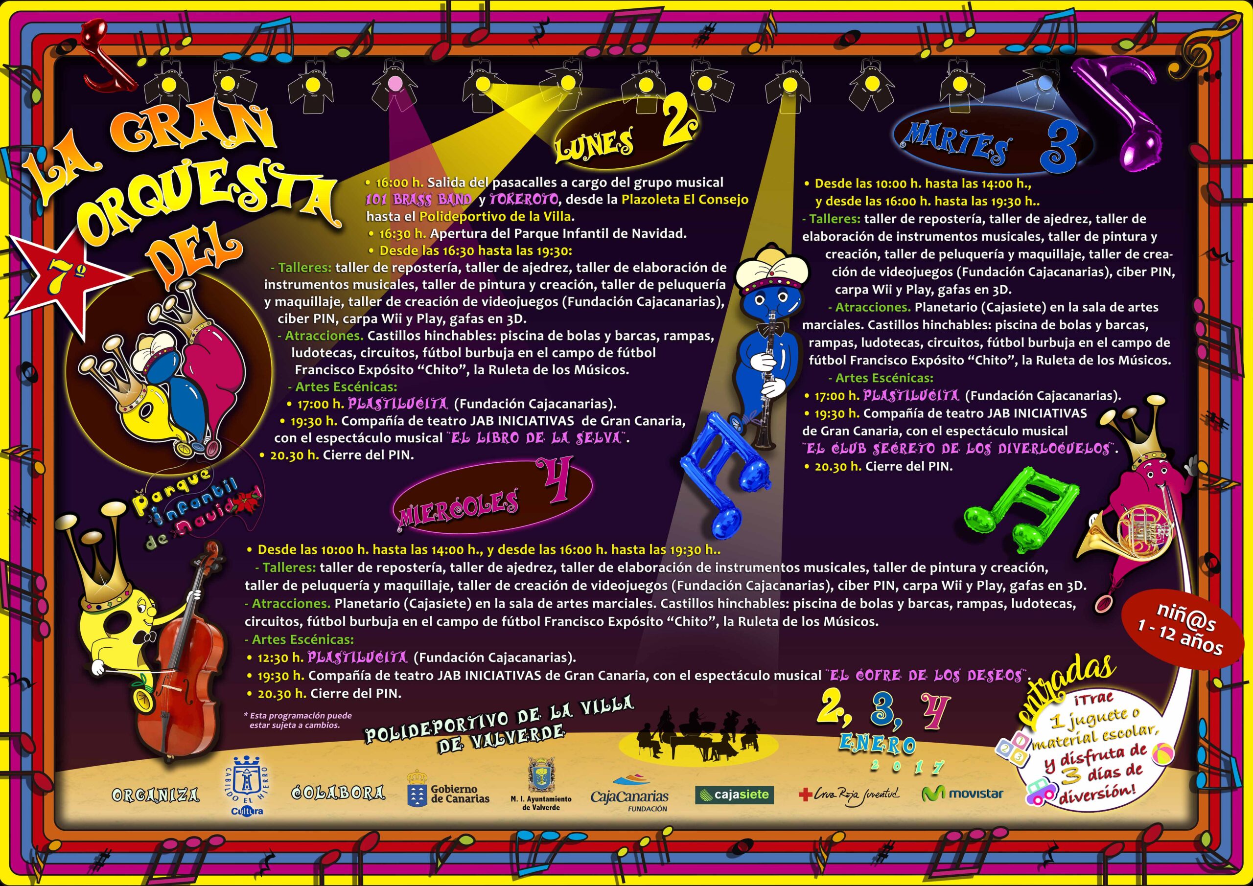 Hoy lunes 2 de enero se llevará a cabo, a las 16:00 horas, un pasacalles desde la plazoleta El Consejo hasta el polideportivo de Valverde a cargo del grupo musical 101 Brass Band y Tokeroto, como antesala a la apertura de este Parque Infantil, prevista para las 16:30 horas.