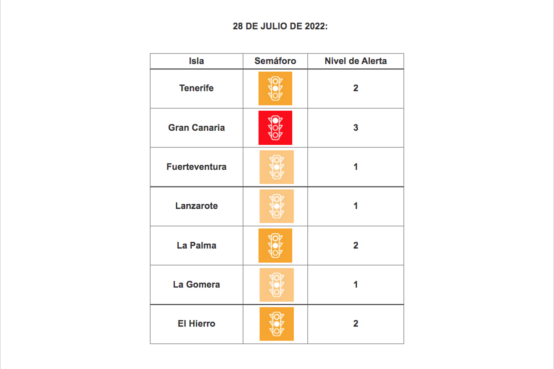 GMº/La Consejería de Sanidad ha actualizado hoy los niveles de alerta sanitaria tras el informe epidemiológico de la Dirección General de Salud Pública, por el que todas islas continúan en el mismo nivel de alerta en el que se encontraban tras la última actualización, Gran Canaria continúa en nivel 3 o de riesgo alto; Tenerife, La Palma y El Hierro en nivel 2 o de riesgo medio; y Lanzarote (La Graciosa), Fuerteventura, y La Gomera en nivel 1, o de riesgo bajo. El Hierro se sitúa entre los niveles de riesgo alto – muy alto de indicadores asistenciales.