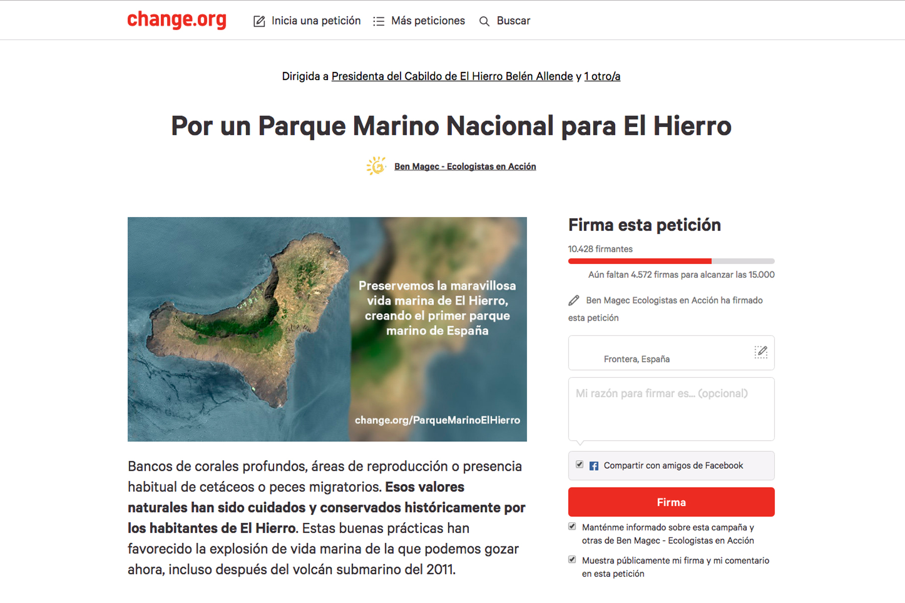 Para las organización Ben Magec – Ecologistas en Acción no le cabe duda que de este imprescindible y enriquecedor debate saldrá el apoyo necesario, pues “con esta recogida de firmas va quedando claro que la sociedad canaria, y particularmente la herreña, comprende los beneficios ambientales y sociales de contar con este espacio de características singulares, y que, en esta petición, hemos resumido en la apuesta por el desarrollo sostenible de la isla, la creación de puestos de trabajo directos, eventuales e indirectos, y la visibilización de la isla en el mapa turístico local, español y global. Hay que recordar que estos valores naturales han sido destacados por la comunidad científica, a través de organizaciones como Oceana o Grennpeace, por el Instituto Español de Oceanografía y por las Universidades Canarias, y que, al mismo tiempo, la isla cuenta con la mayor tasa de paro de Canarias, el menor índice de turistas de las Islas y la renta per cápita más baja. El Parque Nacional podría ser una solución que diera respuesta tanto para la conservación de un espacio rico en biodiversidad como para la mejora de la calidad de vida del pueblo herreño. Hay que resaltar que esta iniciativa comprende únicamente el área marina y no se adentra en tierra” expresan desde la organización ecologista.