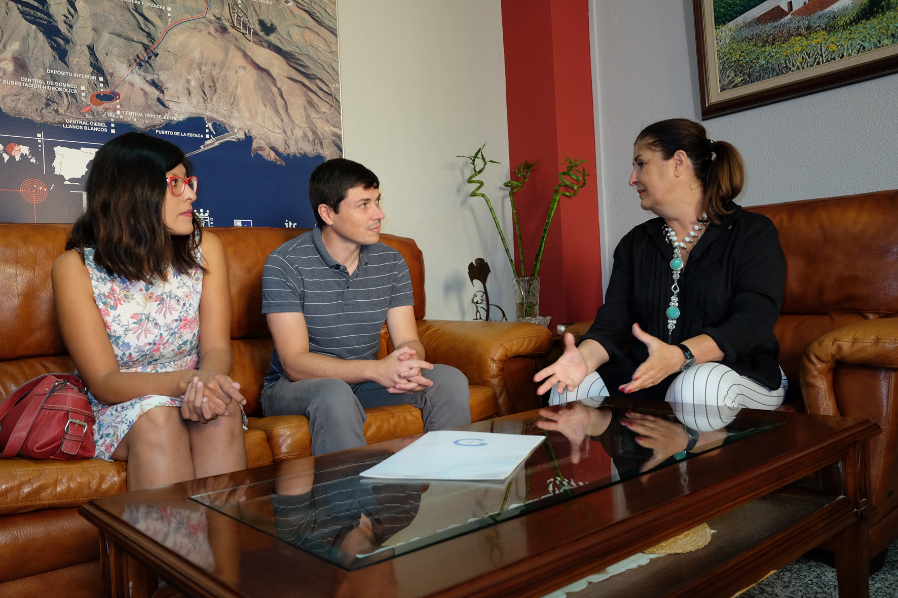 La presidenta de Gorona del Viento y el Cabildo herreño, Belén Allende, recibió a dos de los estudiantes que en estos días terminan su periodo de formación práctica en la Central Hidroeólica, con la intención de felicitarles por la buena evolución que han hecho constar en la empresa, así como para ponerse a disposición de los estudiantes “en todas aquellas cuestiones consideren que son mejorables de cara a seguir trabajando por esta línea porque, sincera y realmente, tenemos una firme intención de seguir acercándonos al campo de la formación y que esta interacción tenga beneficios reales, palpables y motivadores en el devenir de los alumnos”, explicó Allende.