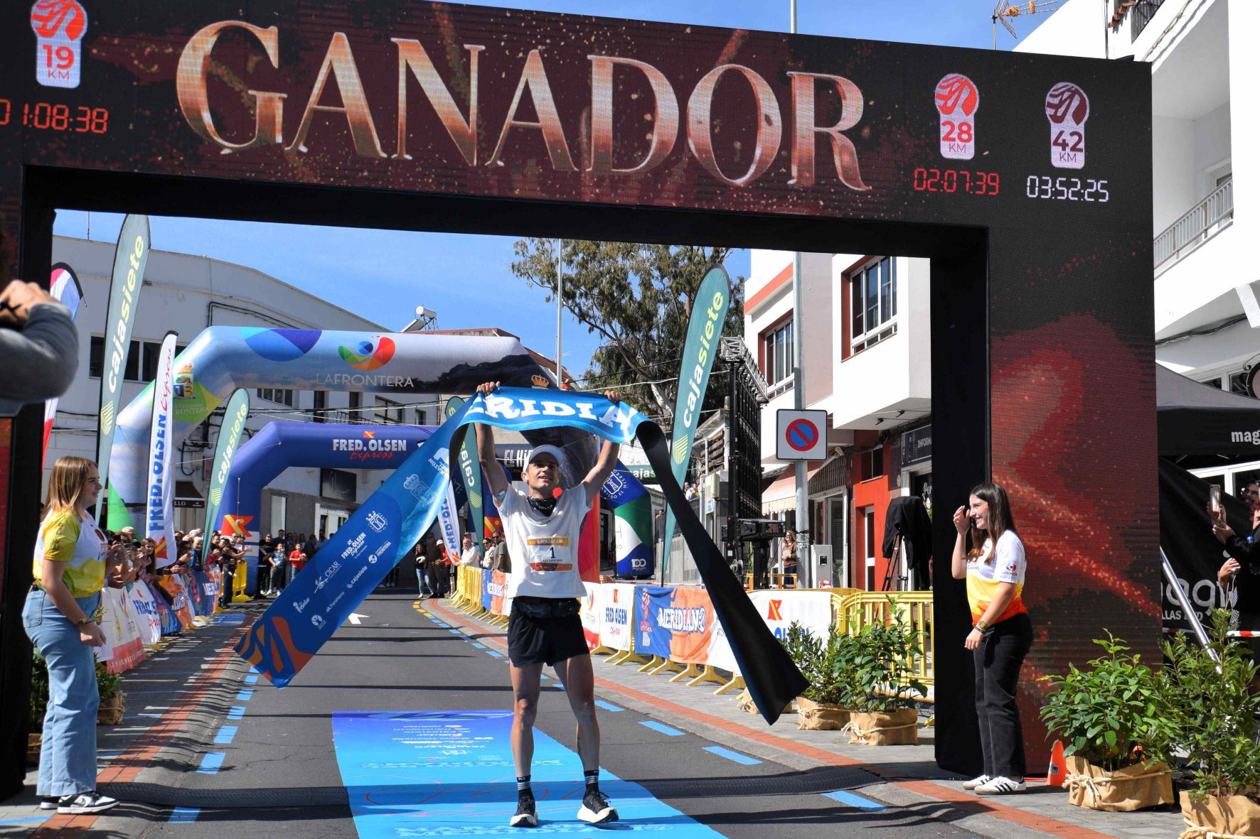 Redacción/Los corredores Mario Olmedo, con un tiempo de 3:52:24, y Aida Campos, con un crono de 5:03:20, se impusieron este sábado, en la distancia reina de la Maratón del Meridiano, 42 kilómetros; Aythami López y Judith Wyder se alzaron en los 28 km, con récords de la prueba, mientras que Aythami Brito e Isabel Salazar fueron los vencedores en los 19 km, y Matías Huertas y Ángela Morales ganaron en los 9 km.
