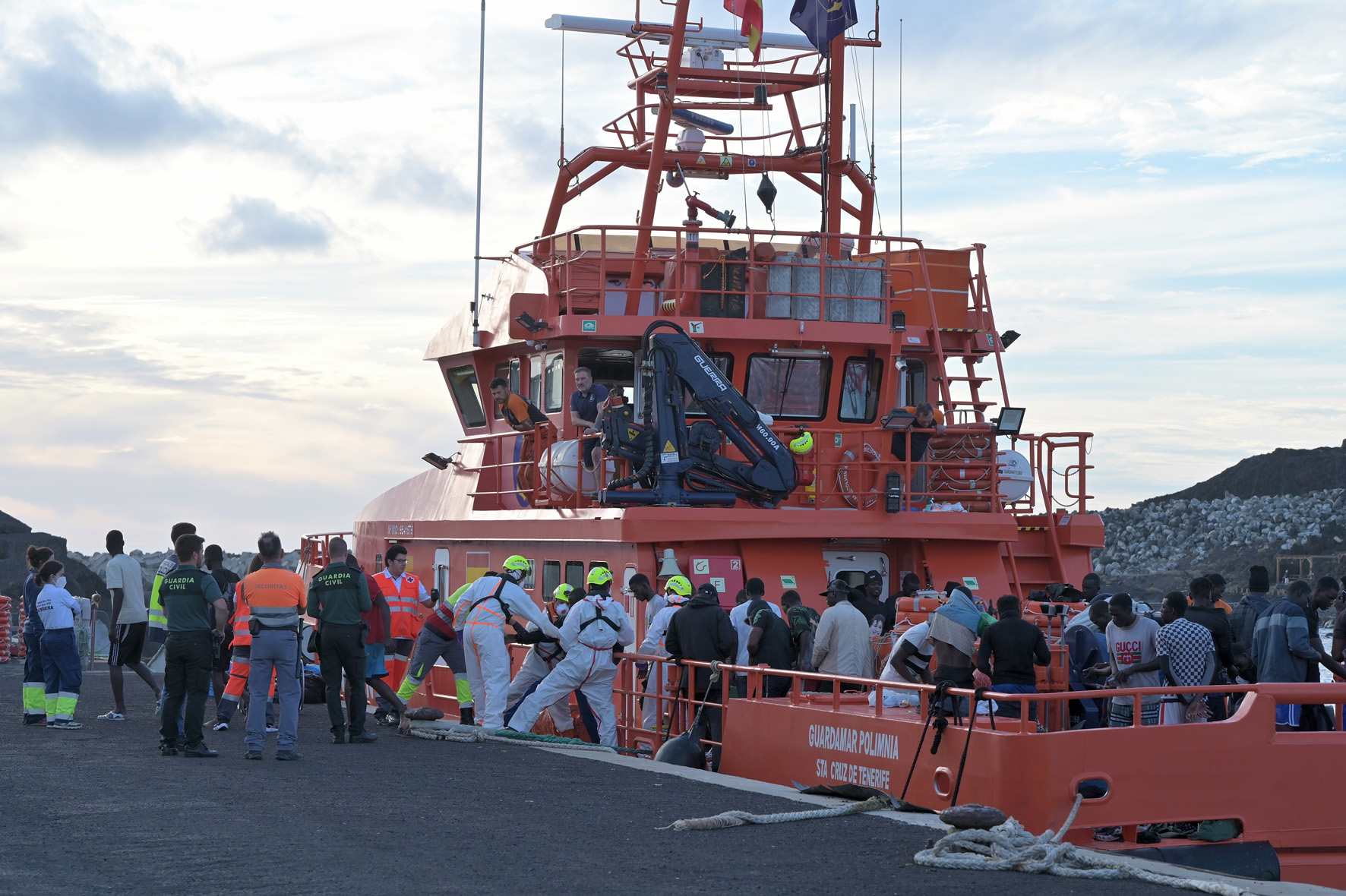 Redacción/La embarcación de Salvamento Marítimo, Guardamar Polimnia, traslado durante la tarde de hoy, en torno a las 18:00 horas, al muelle de La Restinga, en el municipio de El Pinar, a bordo del buque de salvamento, a los tripulantes de 2 cayucos localizados a 49 millas al sur de la isla, con 81 y 70 inmigrantes en su interior, para ser atendidos por los equipos sanitarios y de emergencias.